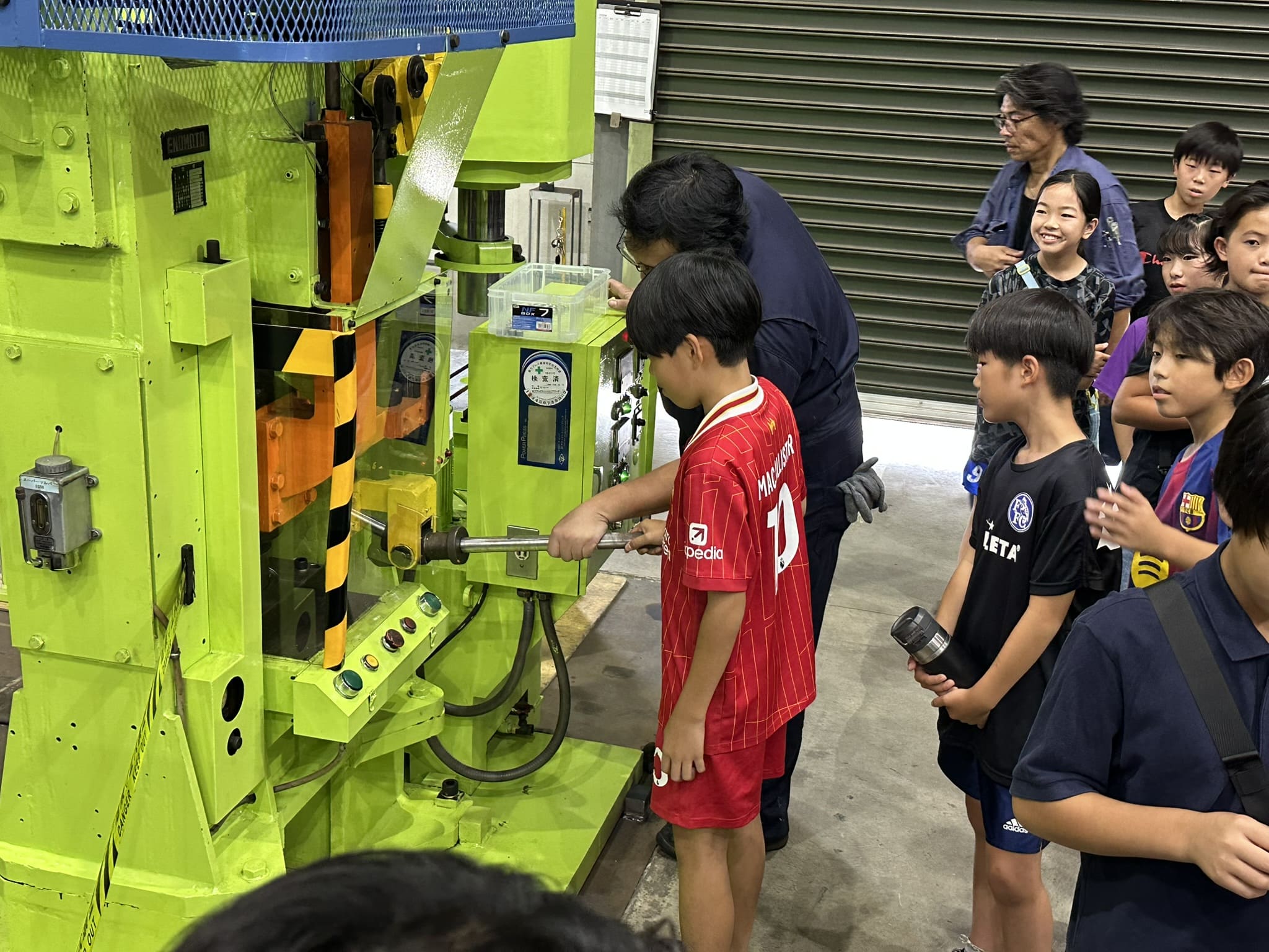 スクリュープレスの製造工程を見学したほか、常設の600トンプレスを実際に動かし、