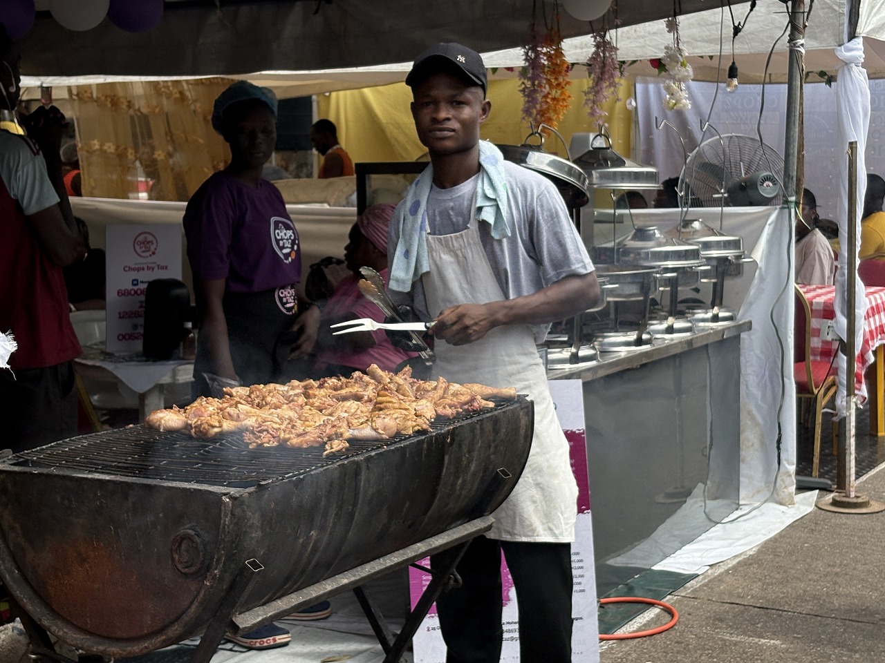 受付で雇った女性は物覚えが良く、頭の良い人達が多く居るのでは無いかと思う。そして言語はほとんどの人が英語を話すのでこれも将来に向けてプラスだろう。ナイジェリアはイギリスの植民地であった。自動車の車線は周辺諸国との整合性の兼ね合いから、かなり以前に右側走行に変わったとの事である。食べ物はインドと近似かと思ったが全然違っていた。ターメリック(ウコン)を使った黄色いいわゆるカレー風の料理が無かった。ご飯が美味しくなく、もっぱらヤムイモ(里芋の大きいやつである)、チキンがふんだんで、展示会場でも外の屋台のチキンで昼食を済ませた。