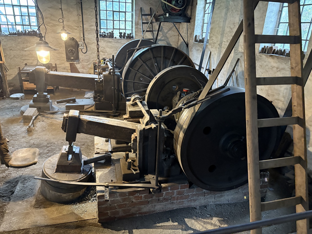 見学当日はスプリングハンマーを使って釘を鍛造していた。日本でも広島県の鞆の浦に船釘を鍛造製造する業種が昔あり、瀬戸内海を行き来する木造船の造船に用いられていたが、それとそっくりだった。鞆の浦は今もなお鍛造業社が数社現存していて、船のアンカーや吊り具を鍛造している。鍛造、つまり鍛冶屋仕事の歴史は古く、日本では弥生時代後期の紀元前1世紀ころに「たたら製鉄」が始まったと同時に鍛造がスタートしている。つまり出来た鉄を加工して道具にする過程の手法が鍛造で、鍛造により農機具や刀などの武器が製造された。その当時は金槌による人力で鍛造をしていたが、ドイツなどヨーロッパでは水車の動力を使い、何か重い落下槌(らっかつい、と読むが、石や岩だったのでは無いか)をその動力で持ち上げてから一挙に落下させる事によりとてつもなく大きな成型力が得られる様になり、船舶や、鉄道や車両の動力・駆動部品の製造に繋がって行くのである。イギリスの産業革命の立役者であった蒸気機関の多くの部品もこれら鍛造装置で鍛造された強度の高い部品であった。大きな動力は川から得られ、今でもドイツの古い鍛造工場は川の横に立地している。