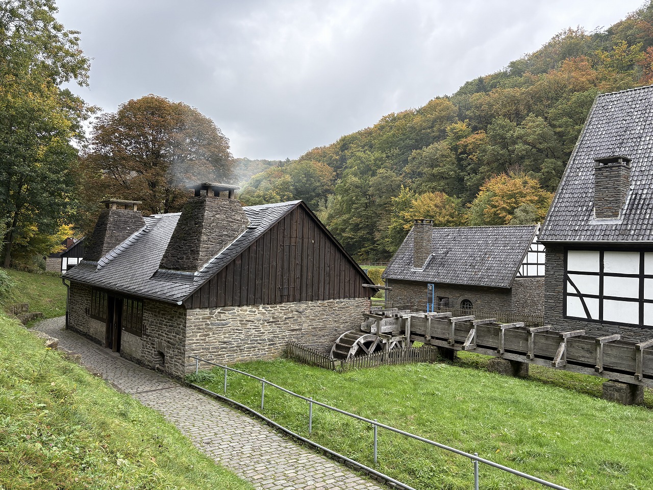 自然を満喫しながら散歩しながら見学ができる。単なる展示ではなく、職人たちの作業を見ることができる参加型の博物館で、鍛造の発祥の過程が判るので長い間訪問したいと思っていたが、ちょうど昨年10月にフランクフルトで国際鍛造会議が開催されたので、スポンサー参加したついでに一日かけて念願の訪問が出来た。渓谷地にある最も大きな理由は渓流の水である。展示され、稼動する事の出来る機械装置の動力源は水車である。ここで添付している最初の写真は鍛造工場の外に設置された水車で、この回転動力を屋内に引き込み、てこの一端を押し下げてから一挙にはずし、てこを落下させ焼けた金属を成型する鍛造装置が展示されていた。